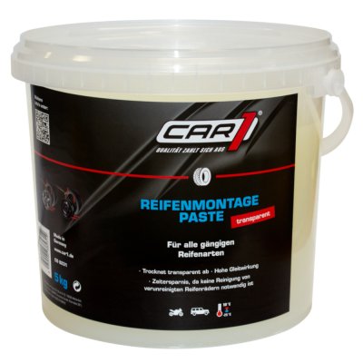 Diese Reifenmontagepaste trocknet transparent und schnell ab und ist für alle gängigen Reifen von PKW, LKW und Motorrädern, sowie Breit- und Run-Flat Reifen, bestens geeignet.