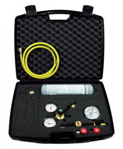 Formiergasset (H2/N2) im Koffer inkl. 1 l Formiergas-Einwegzylinder, Druckminderer mit Adapter für 10 l Gasflaschen (Linksgewinde) und Adapter für 1 l Einweggaszylinder, 1,5 m Füllschlauch, Druckmanometer mit Absperrventil (für Dichtheitskontrolle) und R134a / R1234yf HD-Servicekupplungen.